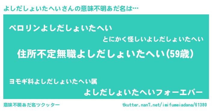 | 欧米人風あだ名 | 『ダレノガレよしだしょいたへい』 |