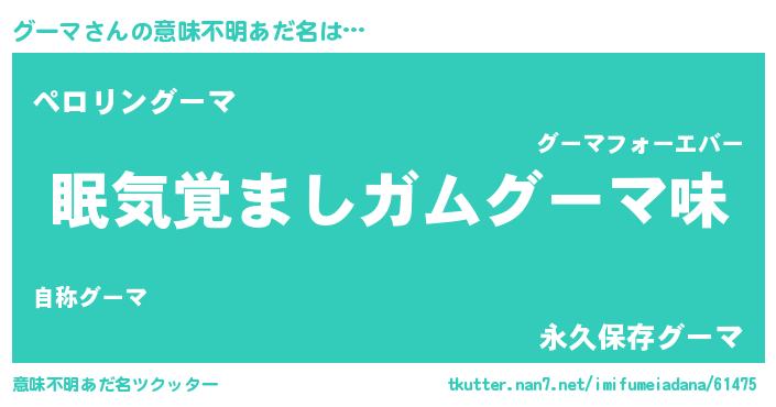| 男性向けラノベタイトル風あだ名 | 『グーマに滅ぼされるだけの簡単なお仕事です』 |