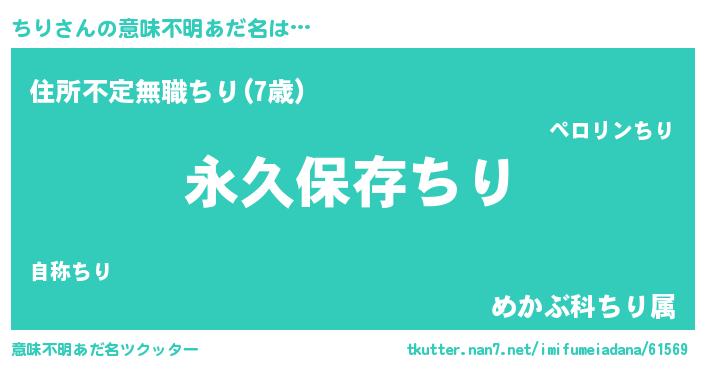 | 男性向けラノベタイトル風あだ名 | 『ちりという概念が存在しない退屈な世界 』 |