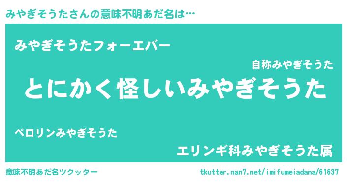 | 男性向けラノベタイトル風あだ名 | 『みやぎそうたの嫁は女の子じゃないと思った?』 |