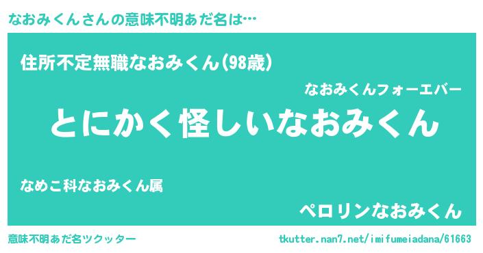 | 男性向けラノベタイトル風あだ名 | 『ダンジョンになおみくんを求めるのは間違っているだろうか』 |