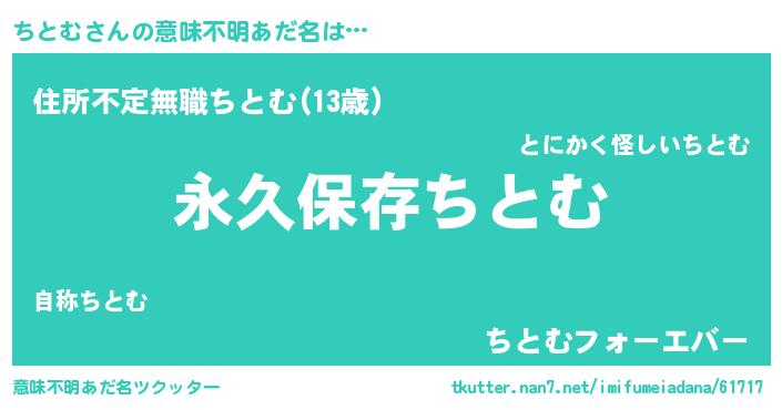 | 男性向けラノベタイトル風あだ名 | 『ちとむという概念が存在しない退屈な世界 』 |