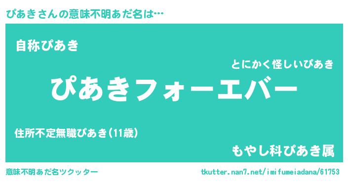 | 女子向けラノベタイトル風あだ名 | 『ぴあきの雑貨屋さん』『闇のぴあき』 |