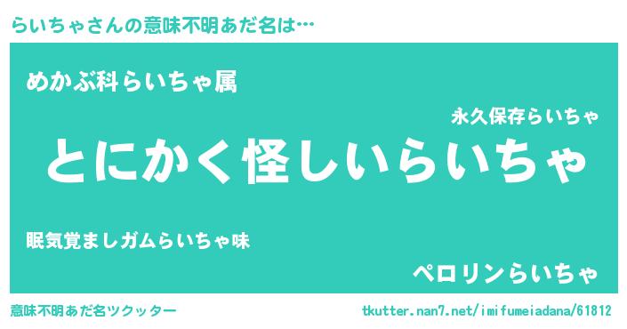 | 欧米人風あだ名 | 『ウサインらいちゃ』『マイケルらいちゃ』 |