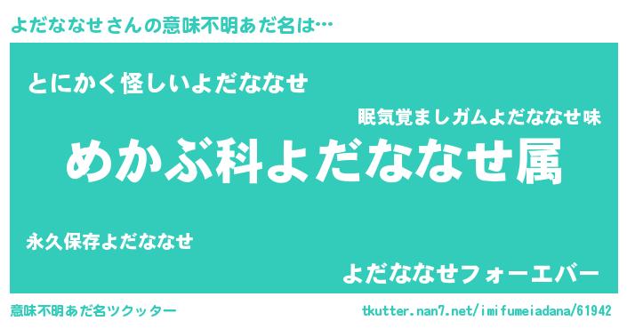 | 胡散臭い通販商品みたいなあだ名 | 『信頼と実績のサプリメント…その名も「よだななせ」』 |