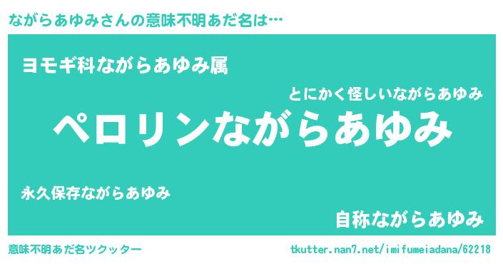 | 女子向けラノベタイトル風あだ名 | 『(仮)ながらあゆみのやんごとなき事情』 |