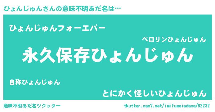 | 男性向けラノベタイトル風あだ名 | 『ひょんじゅんという概念が存在しない退屈な世界 』 |