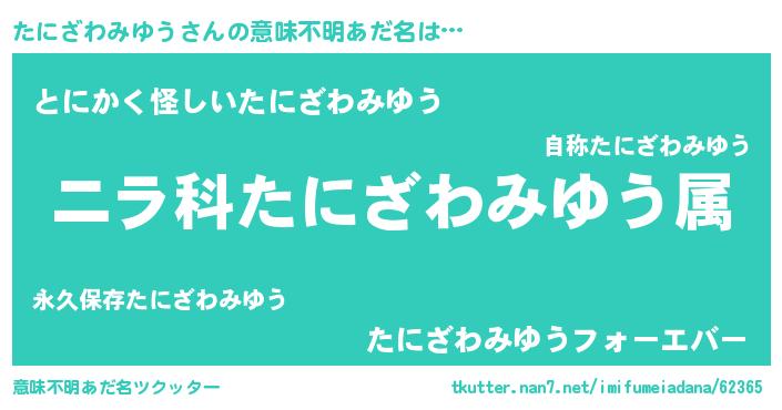 | 男性向けラノベタイトル風あだ名 | 『たにざわみゆう~年齢イコール彼女いない歴の魔法使い~』 |
