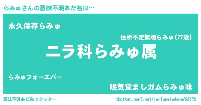 | 男性向けラノベタイトル風あだ名 | 『らみゅ~年齢イコール彼女いない歴の魔法使い~』 |