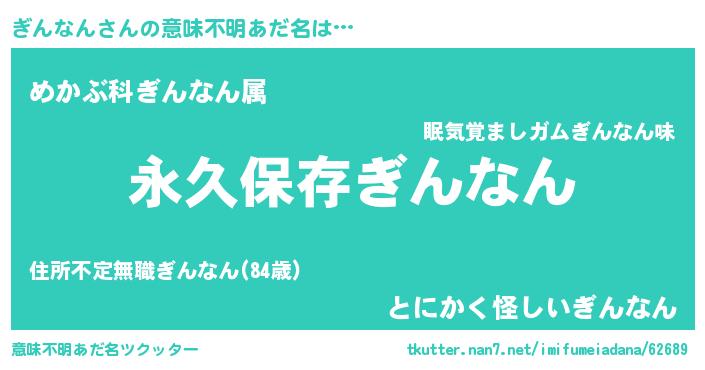 | 男性向けラノベタイトル風あだ名 | 『ぎんなんという概念が存在しない退屈な世界 』 |