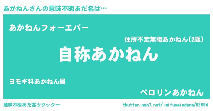 | 男性向けラノベタイトル風あだ名 | 『Re:あかねんから始める異世界生活』 |