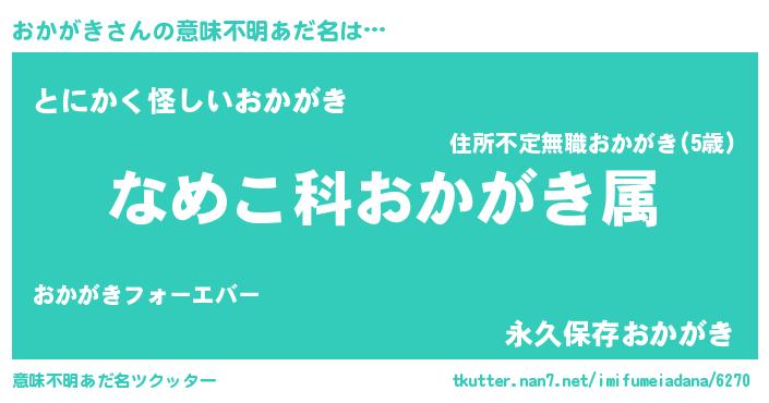 | 男性向けラノベタイトル風あだ名 | 『転生したらおかがきだった件』 |