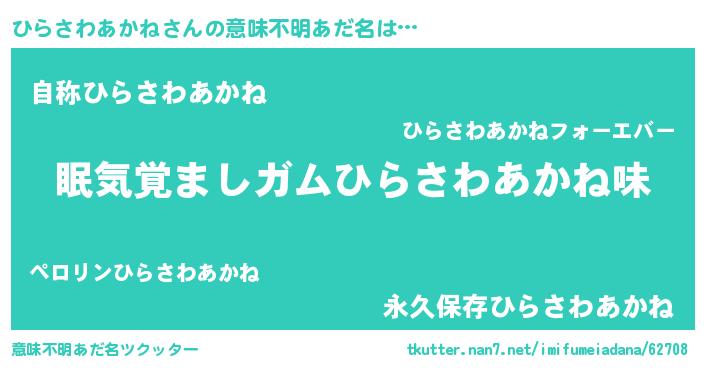 | 女子向けラノベタイトル風あだ名 | 『ひらさわあかね夫妻のなれそめ』 |