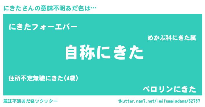 | 女子向けラノベタイトル風あだ名 | 『闇のにきた』『にきたの雑貨屋さん』 |