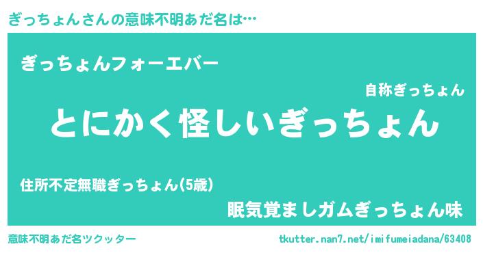 | 男性向けラノベタイトル風あだ名 | 『ぎっちょんの嫁は女の子じゃないと思った?』 |