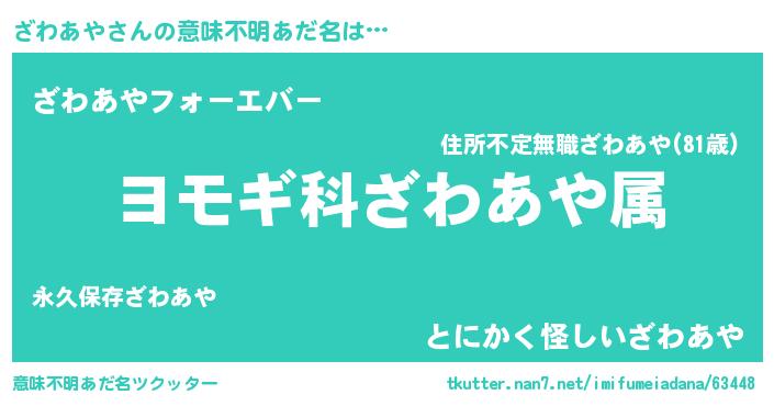 | 男性向けラノベタイトル風あだ名 | 『ざわあやに滅ぼされるだけの簡単なお仕事です』 |