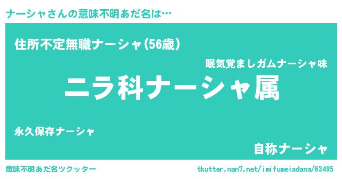 | 男性向けラノベタイトル風あだ名 | 『ナーシャ~年齢イコール彼女いない歴の魔法使い~』 |