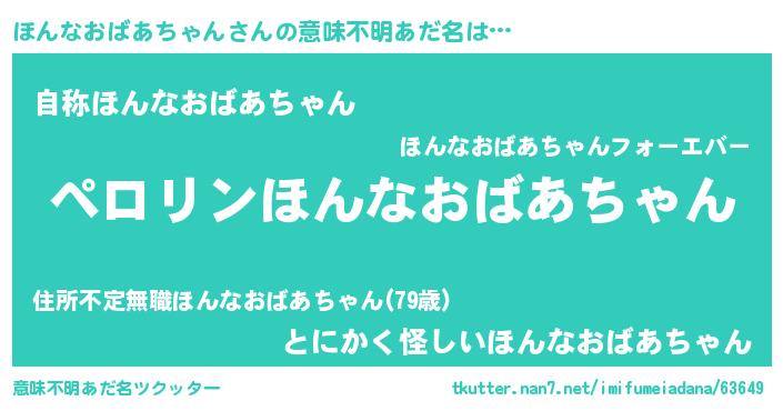 | 欧米人風あだ名 | 『アンジェラ・ほんなおばあちゃん』 |
