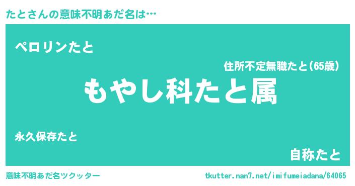 | 男性向けラノベタイトル風あだ名 | 『転生したらたとだった件』『たとの憂鬱』 |