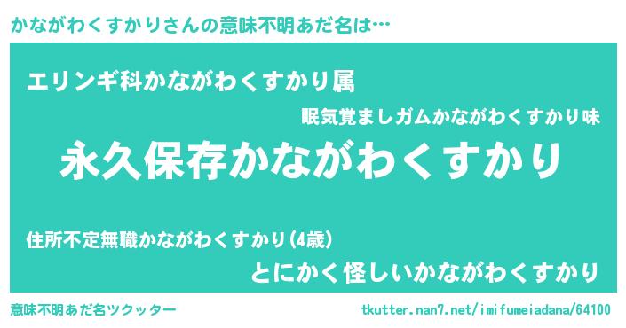 | 女子向けラノベタイトル風あだ名 | 『異世界で失敗しない100のかながわくすかり』 |