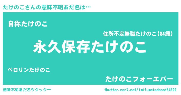 | 女子向けラノベタイトル風あだ名 | 『異世界で失敗しない100のたけのこ』 |