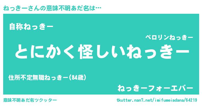 | 男性向けラノベタイトル風あだ名 | 『ねっきーの嫁は女の子じゃないと思った?』 |