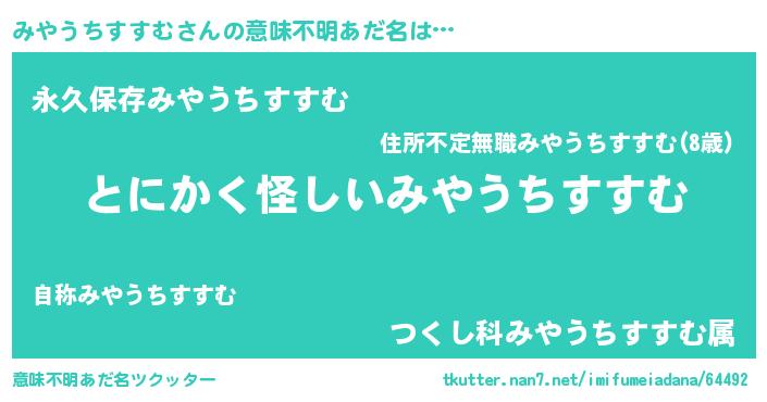 | 男性向けラノベタイトル風あだ名 | 『みやうちすすむに滅ぼされるだけの簡単なお仕事です』 |