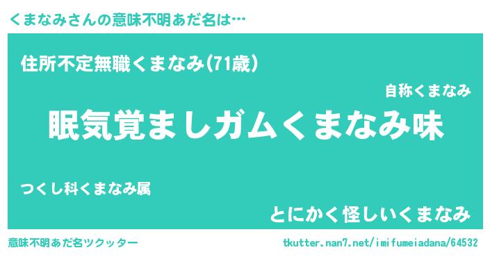 | 男性向けラノベタイトル風あだ名 | 『おまえをオタクにしてやるから、俺をくまなみにしてくれ! 』 |