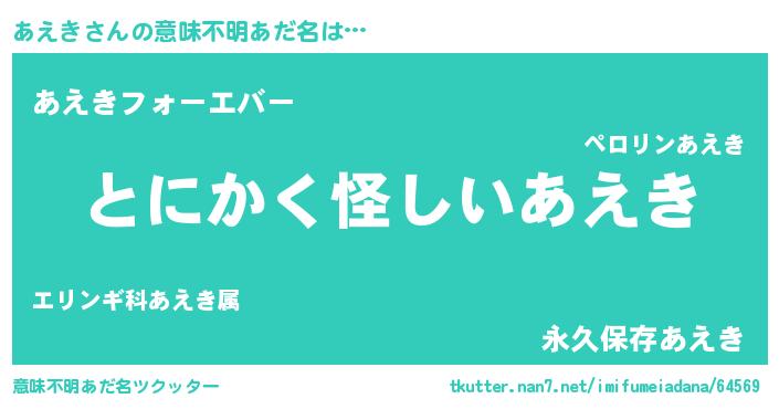 | 男性向けラノベタイトル風あだ名 | 『あえきの嫁は女の子じゃないと思った?』 |