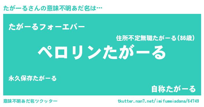 | 男性向けラノベタイトル風あだ名 | 『たがーるの憂鬱』『魔弾の王とたがーる』 |