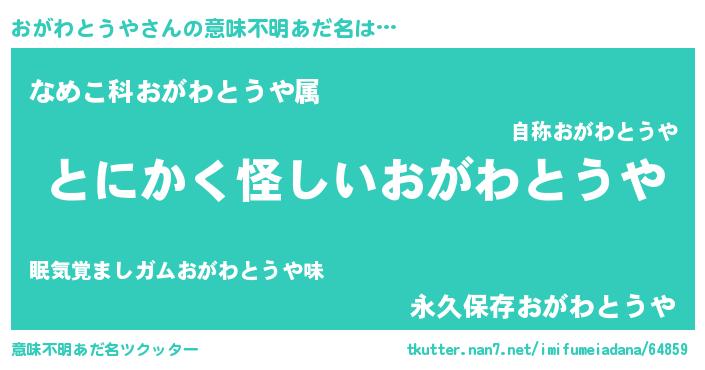 | 女子向けラノベタイトル風あだ名 | 『おがわとうやの卵を拾いまして』 |