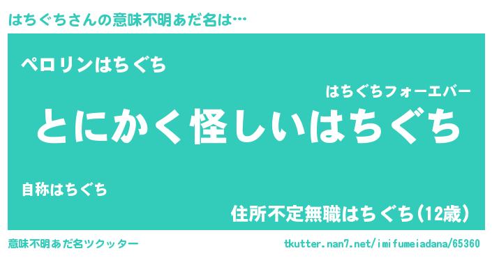 | 男性向けラノベタイトル風あだ名 | 『はちぐちの嫁は女の子じゃないと思った?』 |