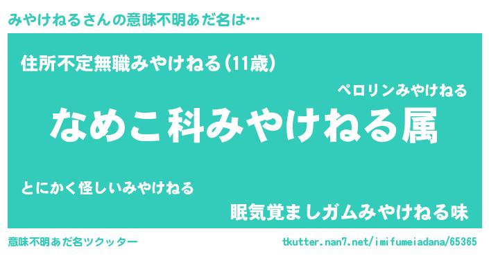 | 男性向けラノベタイトル風あだ名 | 『転生したらみやけねるだった件』 |
