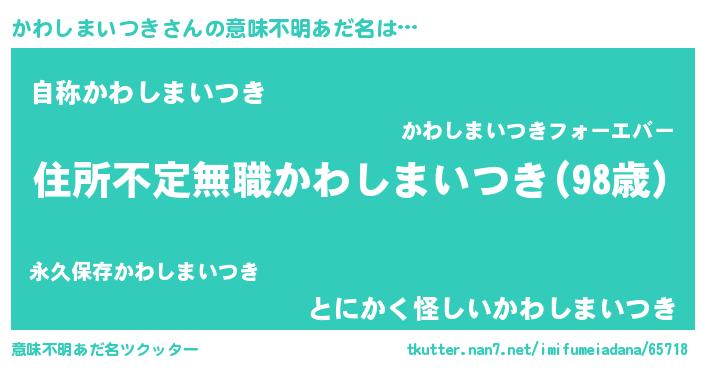 | 男性向けラノベタイトル風あだ名 | 『この素晴らしい世界にかわしまいつきを!』 |