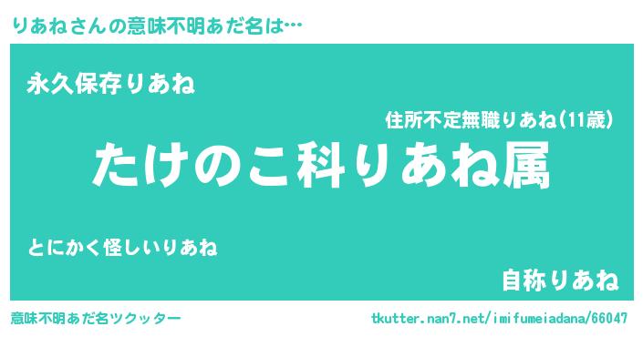| 胡散臭い通販商品みたいなあだ名 | 『来世でも幸せになれる健康食品…その名も「りあね」』 |