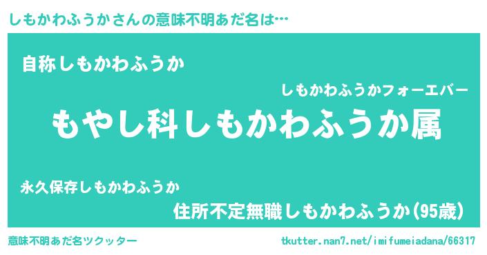 | 胡散臭い通販商品みたいなあだ名 | 『テレビで話題のアガリクス…その名も「しもかわふうか」』 |