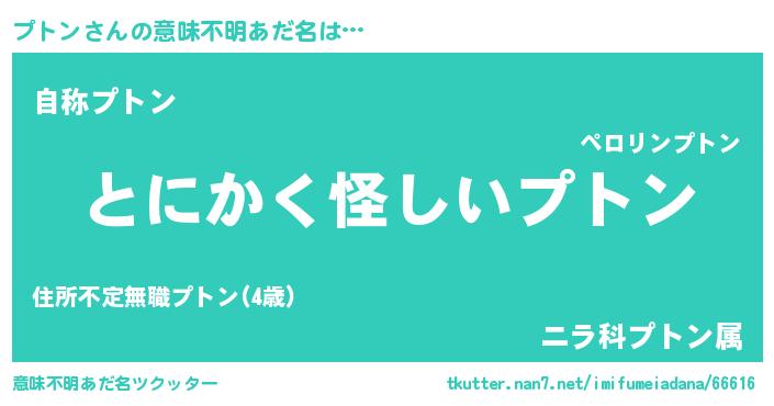| 男性向けラノベタイトル風あだ名 | 『プトンの嫁は女の子じゃないと思った?』 |