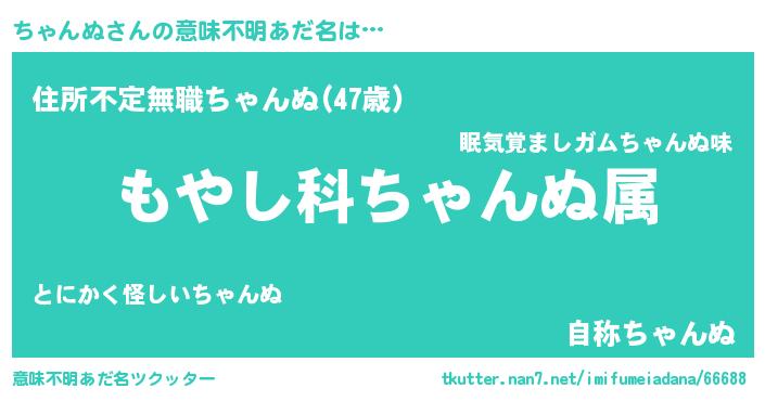| 男性向けラノベタイトル風あだ名 | 『転生したらちゃんぬだった件』 |
