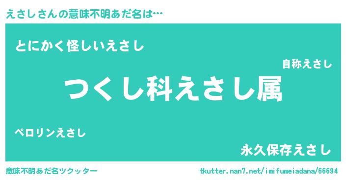 | 男性向けラノベタイトル風あだ名 | 『えさし~年齢イコール彼女いない歴の魔法使い~』 |