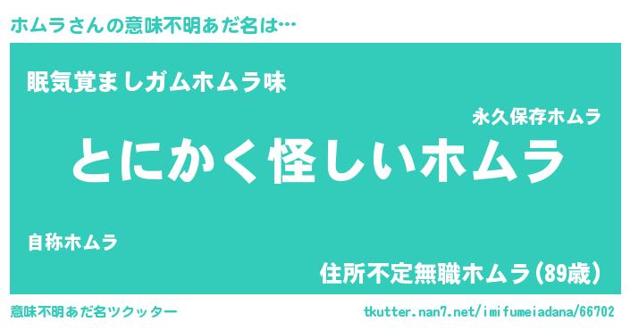 | 女子向けラノベタイトル風あだ名 | 『ホムラの卵を拾いまして』『闇のホムラ』 |