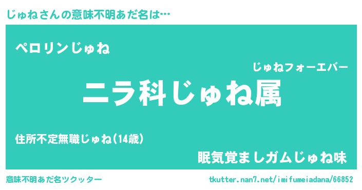 | 男性向けラノベタイトル風あだ名 | 『じゅねに滅ぼされるだけの簡単なお仕事です』 |