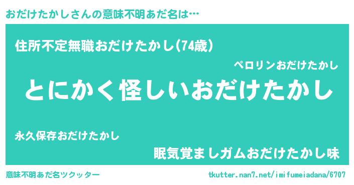 | 女子向けラノベタイトル風あだ名 | 『おだけたかしの卵を拾いまして』 |