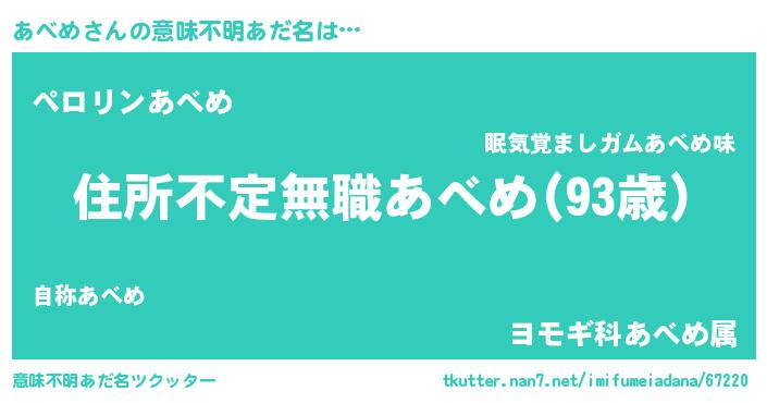 | 男性向けラノベタイトル風あだ名 | 『魔弾の王とあべめ』『あべめの憂鬱』 |