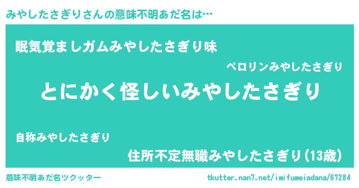 | 男性向けラノベタイトル風あだ名 | 『うちのみやしたさぎりが世界を掌握している!』 |