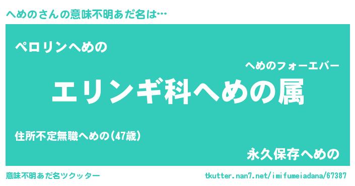 | 男性向けラノベタイトル風あだ名 | 『ヘメノスレイヤー』『へめのの憂鬱』 |