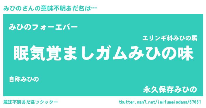 | 男性向けラノベタイトル風あだ名 | 『おまえをオタクにしてやるから、俺をみひのにしてくれ! 』 |