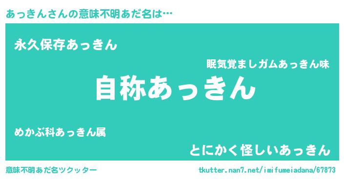 | 男性向けラノベタイトル風あだ名 | 『Re:あっきんから始める異世界生活』 |