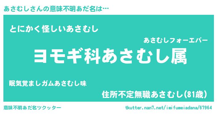 | 男性向けラノベタイトル風あだ名 | 『あさむし~年齢イコール彼女いない歴の魔法使い~』 |