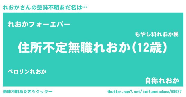 | 男性向けラノベタイトル風あだ名 | 『この素晴らしい世界にれおかを!』 |
