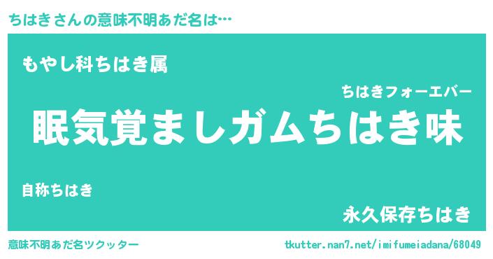| 男性向けラノベタイトル風あだ名 | 『ちはきに滅ぼされるだけの簡単なお仕事です』 |